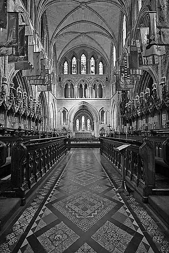 La chapelle de l’Ordre était à l’origine dans la cathédrale Saint-Patrick de Dublin[32]. Chaque membre de l’Ordre, y compris le souverain, recevait une stalle dans le chœur de la chapelle au-dessus de laquelle on plaçait ses insignes héraldiques. Au sommet d’une stalle, il y avait un heaume décoré d’une cape et surmonté de son cimier. Au-dessus du cimier, on plaçait l’étendard du chevalier griffé de ses armoiries. À l’arrière de la stalle, une plaque de cuivre était apposée avec le nom de l’occupant, ses armoiries et sa date d’entrée dans l’Ordre. À la mort d’un chevalier, l’étendard et le cimier étaient remplacés par ceux du successeur. Après le désétablissement de l’Église en 1871, la chapelle cessa d’être utilisée. Les emblèmes héraldiques des chevaliers de l’époque restèrent en place à la demande de la reine Victoria[33].