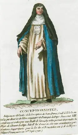 Les moniales Conceptionnistes sont des religieuses cloîtrées dédiées à la prière contemplative. Leur habit est composé d'une robe et d'un scapulaire blanc, un voile noir et une cape bleue. Chaque monastère est autonome et géré par une abbesse.