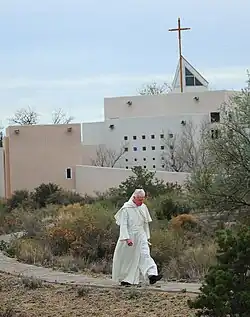 Chanoine prémontré devant les bâtiments de l'abbaye Sainte-Marie de la Vid, Nouveau-Mexique.