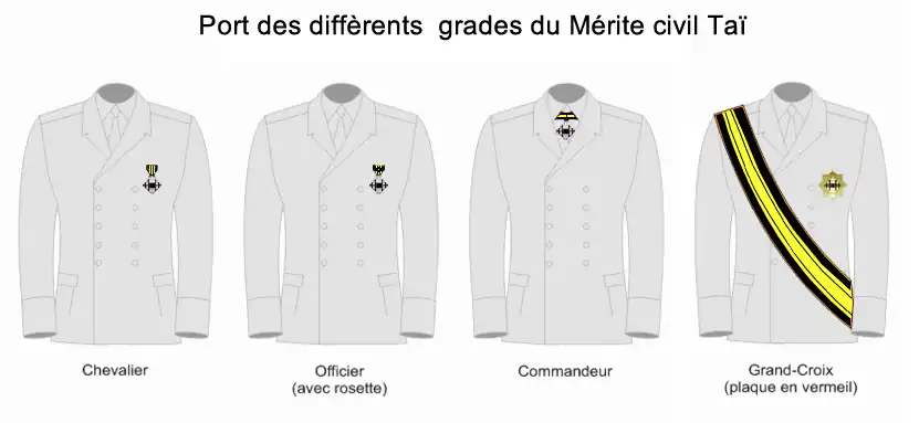 | Chevalier du Mérite civil Taï | Officier du Mérite civil Taï | Commandeur du Mérite civil Taï | Grand croix du Mérite civil Taï |