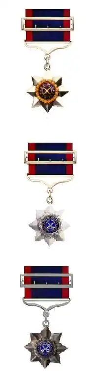- Étoile à huit branches en argent avec un cercle bleu au centre. Sur le cercle, une couronne de lauriers en or et des épées entrecroisées et la devise « awarded for valour » (1837-1944) puis « awarded for gallantry » (1944-1947)