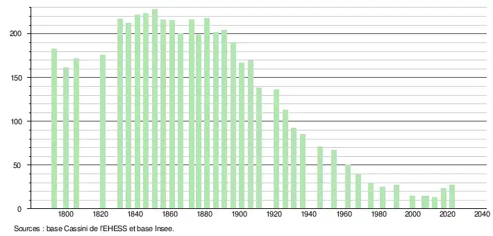 L'évolution du nombre d'habitants est connue à travers les recensements de la population effectués dans la commune depuis 1793. Pour les communes de moins de 10 000 habitants, une enquête de recensement portant sur toute la population est réalisée tous les cinq ans, les populations de référence des années intermédiaires étant quant à elles estimées par interpolation ou extrapolation[35]. Pour la commune, le premier recensement exhaustif entrant dans le cadre du nouveau dispositif a été réalisé en 2007[36].