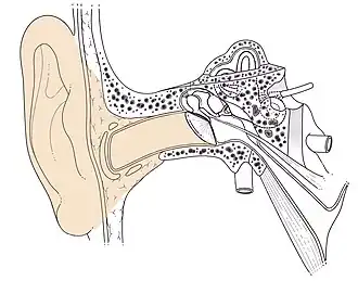 L'oreille externe chez les mammifères comprend deux segments, deux entités anatomiques : le pavillon (ou auricule) et le conduit auditif externe.