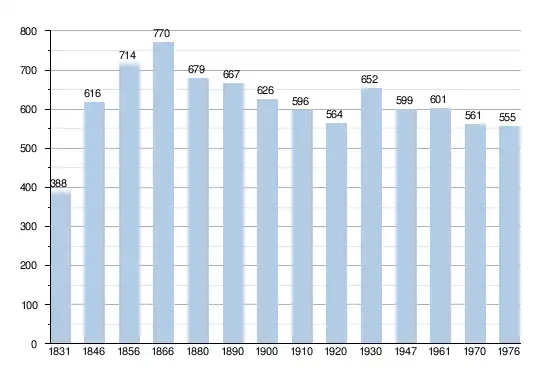 - Sources:INS, Rem:1831 jusqu'en 1970=recensements, 1976= nombre d'habitants au 31 décembre