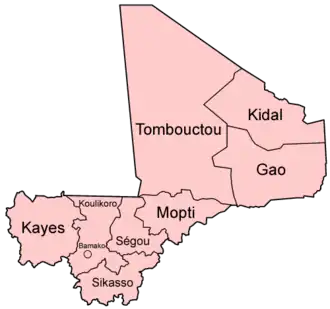 Le Mali est divisé en 19 régions administratives : Kayes, Koulikoro, Sikasso, Ségou, Moptis, Tombouctou, Gao, Kidal, Taoudénit, Ménaka, Nioros, Bougouni, Dioïla, Koutiala, Kita, Nara, Bandiagara, San et Douentza. Bamako possède un statut particulier ; le district de Bamako regroupe six communes urbaines.