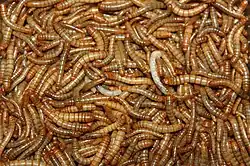 - Ténébrion meunier (Tenebrio molitor) est un insecte coléoptère de la famille des ténébrionidés qui affectionne notamment les farines de céréales et dont la larve se montre capable de manger certaines formes de polystyrène expansé[7]. Une expérimentation montre qu'il faut 138 jours à 100 vers de farine pour manger un Masque de protection FFP jetable réduit en microparticules de plastique mélangées à du son de blé. Ce qui serait insuffisant pour intégrer ce processus dans une chaîne alimentaire durable au sein d'un système d'élevage[8],[9].