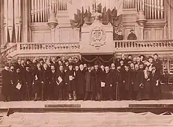 3e rang : Paul Dukas (5e), Gustave Lyon (Pleyel), Enesco, André Bloch, à droite du drapé : Alexandre Georges (3e), Paul Le Flem, Roger Lion (Pleyel)