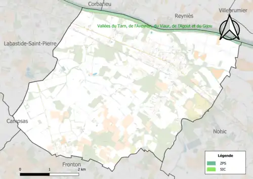 Le réseau Natura 2000 est un réseau écologique européen de sites naturels d'intérêt écologique élaboré à partir des directives habitats et oiseaux, constitué de zones spéciales de conservation (ZSC) et de zones de protection spéciale (ZPS)[Note 2]. Un site Natura 2000 a été défini sur la commune au titre de la directive habitats : Les « vallées du Tarn, de l'Aveyron, du Viaur, de l'Agout et du Gijou »[14], d'une superficie de 17 144 ha, s'étendant sur 136 communes dont 41 dans l'Aveyron, 8 en Haute-Garonne, 50 dans le Tarn et 37 dans le Tarn-et-Garonne. Elles présentent une très grande diversité d'habitats et d'espèces dans ce vaste réseau de cours d'eau et de gorges. La présence de la Loutre d'Europe et de la moule perlière d'eau douce est également d'un intérêt majeur[15].