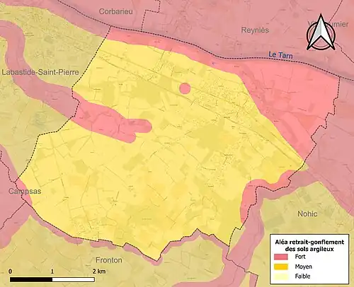 Le retrait-gonflement des sols argileux est susceptible d'engendrer des dommages importants aux bâtiments en cas d’alternance de périodes de sécheresse et de pluie. La totalité de la commune est en aléa moyen ou fort (92 % au niveau départemental et 48,5 % au niveau national). Sur les 602 bâtiments dénombrés sur la commune en 2019, 602 sont en aléa moyen ou fort, soit 100 %, à comparer aux 96 % au niveau départemental et 54 % au niveau national. Une cartographie de l'exposition du territoire national au retrait gonflement des sols argileux est disponible sur le site du BRGM[26],[Carte 3].