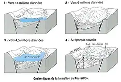 - ↑ Clauzon G. 1990. Restitution de l’évolution géodynamique néogène du bassin du Roussillon et de l'unité adjacente des Corbières d'après les données écographiques et paléogéographiques. Paléobiologie Continentale, 17, 125-155.