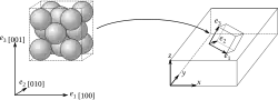 Le cristallite dispose également d'un repère lié aux directions principales de son réseau cristallin. Pour définir l'orientation d'un cristallite dans l'objet, il suffit donc de définir les rotations permettant de passer du repère de l'objet au repère du cristallite : les angles d'Euler.