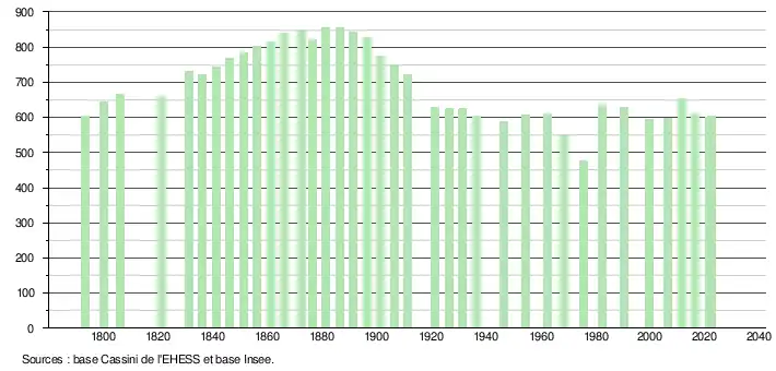 L'évolution du nombre d'habitants est connue à travers les recensements de la population effectués dans la commune depuis 1793. Pour les communes de moins de 10 000 habitants, une enquête de recensement portant sur toute la population est réalisée tous les cinq ans, les populations de référence des années intermédiaires étant quant à elles estimées par interpolation ou extrapolation[16]. Pour la commune, le premier recensement exhaustif entrant dans le cadre du nouveau dispositif a été réalisé en 2006[17].