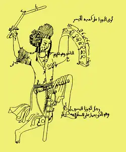 En permutant les syllabes de الجوزاء al-Ğawzā’, ce qui donne الزوزة al-zawğa, « l’Épouse », l’imagination populaire a forgé une légende fort connue. C’est ainsi que سهيل Suhayl (α Car), épousa الجوزاء al-Ğawzā, qui se présente comme une divinité chasseresse dont القوس l’Arc, situé au nord-ouest de la figure, est bandé vers la Patte septentrionale du Superlion (αβ Gem), et qui porte à l’est une abondante « chevelure » (ذواٸب الجوزاء, ḏawā’ib). Mais voici qu’en entrant la couche de l’épousée, سهيل Suhayl tombe malencontreusement sur elle et lui brise les vertèbres dorsales, ce qui se traduit par le fait que le groupe formé δεζ Ori est donné chez ᶜAbd al-Raḥmān al-Sūfī al-Ṣūfī, comme فقارالجوزاء Faqār al-Ğawzā’, « les Vertèbres d’Elgeuze »[16]. C’est pourquoi, craignant d’être obligé de rendre compte la vie de l’infortunée jeune femme et ne voulant pas se faire voir au milieu du ciel, il s’enfuit vers le Sud, où il a trouvé sa place et marque le pôle Sud pour les caravaniers et les navigateurs[17].