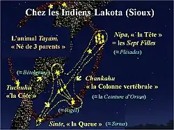 Chez les Sioux Lakotas, Chankahu, « la Colonne vertébrale » de l'animal Tayam, formée par le groupe δεζ Ori, animal dont la Tête, Nipa, correspond aux Pléiades, et Sinte, la Queue tient la place de Sirius. Pour les Lacandons, les quatre étoiles principales du Baudrier d'Orion constituent la constellation du pécari à collier (k'éékèn)[33].