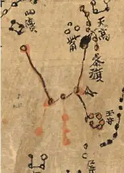 Plus tard, à l’époque Han, quand le ciel chinois est contexturé en constellations, cet astérisme donne son nom à une figure dont le schéma correspond à celui de l’Ωρίων des Grecs[31], dont une carte du ciel de l’époque Tang, établie c. 649-684 et découverte à Dunhuang, dans la province chinoise du Gansu en donne une belle idée[32]