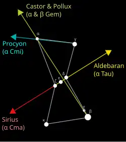 Bételgeuse est l'un des sommets de l'astérisme du Triangle d'hiver, avec Sirius (α CMa) et Procyon (α CMi).
