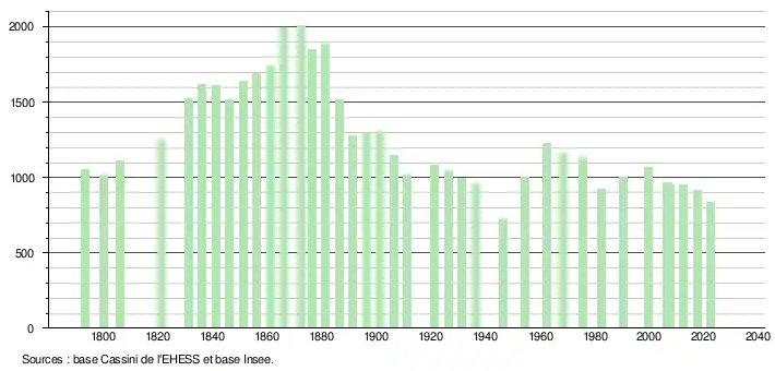L'évolution du nombre d'habitants est connue à travers les recensements de la population effectués dans la commune depuis 1793. Pour les communes de moins de 10 000 habitants, une enquête de recensement portant sur toute la population est réalisée tous les cinq ans, les populations de référence des années intermédiaires étant quant à elles estimées par interpolation ou extrapolation[26]. Pour la commune, le premier recensement exhaustif entrant dans le cadre du nouveau dispositif a été réalisé en 2007[27].