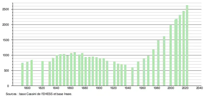L'évolution du nombre d'habitants est connue à travers les recensements de la population effectués dans la commune depuis 1793. Pour les communes de moins de 10 000 habitants, une enquête de recensement portant sur toute la population est réalisée tous les cinq ans, les populations de référence des années intermédiaires étant quant à elles estimées par interpolation ou extrapolation[13]. Pour la commune, le premier recensement exhaustif entrant dans le cadre du nouveau dispositif a été réalisé en 2007[14].