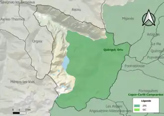 - « vallée et bassin versant de l'Oriège » (8 937 ha), couvrant 9 communes dont 6 dans l'Ariège et 3 dans les Pyrénées-Orientales[34] ;