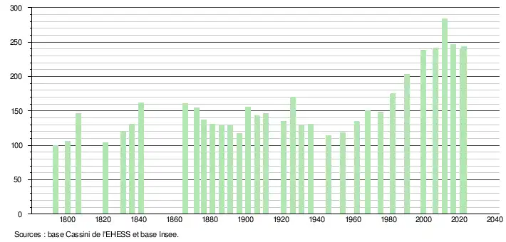 - ↑ Fiches Insee - Populations de référence de la commune pour les années 2006, 2007, 2008, 2009, 2010, 2011, 2012, 2013, 2014, 2015, 2016, 2017, 2018, 2019, 2020, 2021 et 2022.