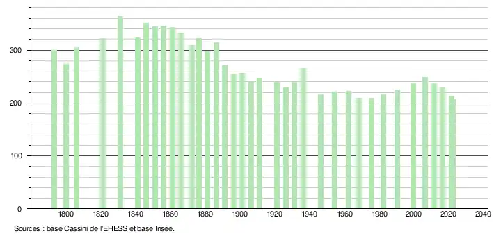 L'évolution du nombre d'habitants est connue à travers les recensements de la population effectués dans la commune depuis 1793. Pour les communes de moins de 10 000 habitants, une enquête de recensement portant sur toute la population est réalisée tous les cinq ans, les populations de référence des années intermédiaires étant quant à elles estimées par interpolation ou extrapolation[34]. Pour la commune, le premier recensement exhaustif entrant dans le cadre du nouveau dispositif a été réalisé en 2006[35].