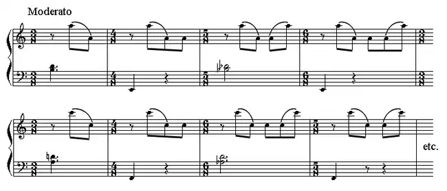 Pour cette pièce, la métrique repose sur le principe d'une variation cyclique, sur une période fixe de quatorze croches[3] :