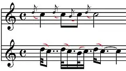 • Le tremblement ou cadence qui est un trille bref et mesuré commençant par la note voisine du dessus. Le pincé est l'équivalent du tremblement en commençant par la note voisine du dessous.