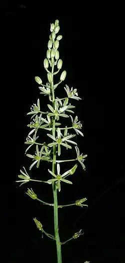 En disparaissant, les feuilles laissent une hampe florale d'assez grande taille (30 à 60 cm), au sommet de laquelle, au départ, une cinquantaine de boutons floraux sont organisés en épi. Au fur et à mesure de l'éclosion, qui commence par la base, chaque fleur en s'épanouissant développe un pétiole qui fait évoluer cet épi en grappe grêle.