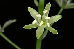 Chaque fleur est blanc verdâtre à six pétales, six étamines et un style égalant les étamines.
