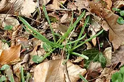 Les feuilles sont longues, étroites, linéaires, engainantes à la base, disposées en rosette basale (étalées) ; elles apparaissent au printemps et sont souvent fanées au moment de la floraison. Elles sont glabres, à nervure centrale marquée, et mesurent environ 5 à 15 mm de large.