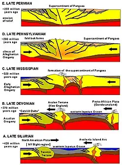 L'orogenèse acadienne est contemporaine de l'orogénèse hercynienne en Europe et de l'orogenèse d'Antler dans le Grand Bassin.