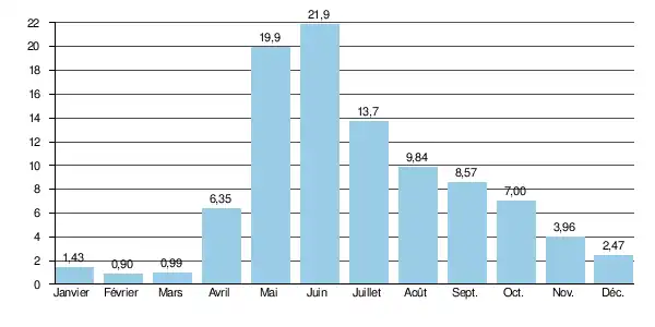 Le débit moyen mensuel observé en février (minimum d'étiage) est de 0,90 m3/s, soit plus de 4 % du débit moyen du mois de juin, maximum de l'année (21,9 m3/s), ce qui témoigne de l'amplitude importante des variations saisonnières. Et ces écarts peuvent être encore bien plus élevés selon les années : sur la durée d'observation de 53 ans, le débit mensuel minimal a été de 0,03 m3/s, soit 30 litres par seconde (), tandis que le débit mensuel maximal s'élevait à 52,2 m3/s ().