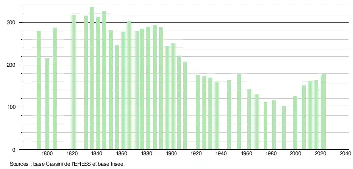L'évolution du nombre d'habitants est connue à travers les recensements de la population effectués dans la commune depuis 1793. Pour les communes de moins de 10 000 habitants, une enquête de recensement portant sur toute la population est réalisée tous les cinq ans, les populations de référence des années intermédiaires étant quant à elles estimées par interpolation ou extrapolation[24]. Pour la commune, le premier recensement exhaustif entrant dans le cadre du nouveau dispositif a été réalisé en 2006[25].