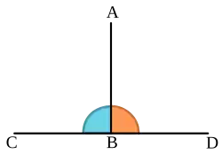 Une première approche intuitive associe l'orthogonalité à l'angle droit. Dans ce paragraphe E est un plan équipé d'une géométrie euclidienne. Comme l'angle droit est défini à l'aide de deux droites sécantes, et que deux droites sécantes sont toujours coplanaires, il n'est pas utile d'aller plus loin. En revanche, les résultats s'appliquent encore dans notre espace usuel de dimension trois. Le plan est formalisé soit par les cinq postulats d'Euclide[1], soit, pour être parfaitement rigoureux, par les vingt axiomes de Hilbert[2]. E possède des transformations particulières, de E dans lui-même, appelées isométries. Elles conservent les distances. Ainsi, si A et B sont deux points de E et ψ une isométrie, la distance entre ψ(A) et ψ(B) est la même que celle entre A et B. Dans un tel espace, les isométries sont les translations, les rotations et les réflexions correspondant à l'image d'un miroir.