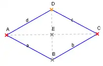 La condition nécessaire et suffisante précédente indiquant qu'un angle est rectangle est remplie et l'angle AIB est droit. Ceci démontre que les deux diagonales d'un losange sont perpendiculaires.