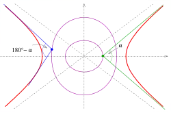 Les branches de l'hyperbole fournissent les isoptiques pour les deux angles α et 180° − α (voir image).
