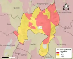 La commune est vulnérable au risque de mouvements de terrains constitué principalement du retrait-gonflement des sols argileux[14]. Cet aléa est susceptible d'engendrer des dommages importants aux bâtiments en cas d’alternance de périodes de sécheresse et de pluie. 97,1 % de la superficie communale est en aléa moyen ou fort (67,5 % au niveau départemental et 48,5 % au niveau national). Sur les 254 bâtiments dénombrés sur la commune en 2019, 252 sont en aléa moyen ou fort, soit 99 %, à comparer aux 90 % au niveau départemental et 54 % au niveau national. Une cartographie de l'exposition du territoire national au retrait gonflement des sols argileux est disponible sur le site du BRGM[15],[Carte 2].