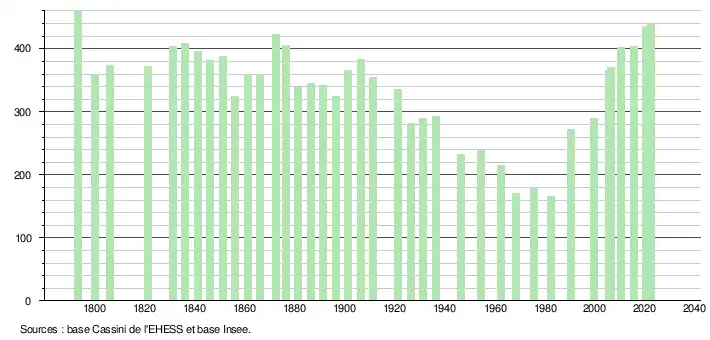 L'évolution du nombre d'habitants est connue à travers les recensements de la population effectués dans la commune depuis 1793. Pour les communes de moins de 10 000 habitants, une enquête de recensement portant sur toute la population est réalisée tous les cinq ans, les populations de référence des années intermédiaires étant quant à elles estimées par interpolation ou extrapolation[18]. Pour la commune, le premier recensement exhaustif entrant dans le cadre du nouveau dispositif a été réalisé en 2005[19].