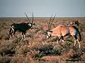 L'oryx gazelle ou gemsbok (Oryx gazella) est une espèce de bovidé souvent considérée comme une antilope, bien qu'elle ne soit pas de la sous-famille des Antilopinae, mais de celle des Hippotraginae. On la trouve des dunes désertiques de la Namibie (il en est d'ailleurs l'animal national[1]) aux savanes arides du désert du Kalahari. Le nom oryx gazelle vient de la beauté de son pelage ; l'animal a de grands traits noirs sur ses flancs, ses pattes et sa tête claire, celle-ci paraissant maquillée. Il est très commun par rapport aux autres espèces d'oryx comme l'oryx algazelle, éteint à l'état sauvage. Comme le gnou, l'oryx gemsbok peut être doré.