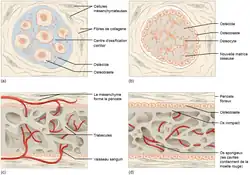 Après un certain nombre de divisions, l'ostéoblaste élabore la matrice osseuse autour de lui ; dans un premier temps au niveau de la surface osseuse puis il s'entoure et se transforme en ostéocyte ou en cellules bordantes (=cellule de réserve, aplatie et ayant la capacité de se re-différencier en ostéoblaste), elles conservent leurs gap junctions qui leur permettent la diffusion des éléments nutritifs.