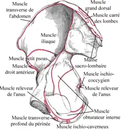 - sur le versant interne, le muscle ischio-coccygien et le muscle releveur de l'anus ;
