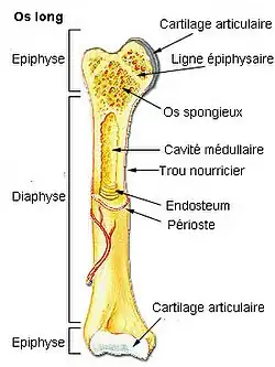 Les os longs sont constitués d'un corps ou diaphyse et de deux extrémités ou épiphyses.