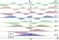 - Les états d'énergie sont espacés de la même quantité . Ceci permet de considérer que le passage de l'état n à l'état n + p correspond à « l'absorption » de p quanta d'énergie par le système. Cette façon de penser est en fait très féconde : ainsi l'étude des vibrations dans les solides conduit-elle à introduire la notion de phonons, qui se comportent comme des quasi-particules. De même, et de façon plus significative, la quantification du champ électromagnétique conduit à introduire les modes propres de ce champ, appelé « photons ».