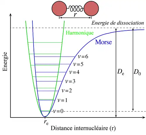 L'approximation « harmonique » est valable au voisinage de la position d'équilibre stable du système : la figure ci-contre illustre la modélisation par un oscillateur harmonique de la courbe d'énergie potentielle d'une molécule diatomique.