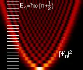 |ψn(x)|2 pour les premières valeurs de l'énergie, en commençant par le fondamental (n = 0) en bas puis en augmentant la valeur de l'énergie en montant. L'axe horizontal correspond à la coordonnée x, les couleurs plus claires indiquent une densité de probabilité plus forte.