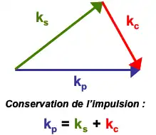 Si on se rappelle que l'impulsion d'un photon est , la relation précédente ne traduit rien d'autre que la conservation de la quantité de mouvement des photons. Comme il s'agit d'une relation vectorielle, cela signifie qu'il peut exister des accords de phase non colinéaires, c'est-à-dire pour des faisceaux pompe, signal et complémentaire se propageant dans des directions différentes.