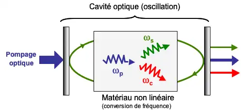 - un milieu non linéaire, à l'origine de la conversion de fréquence effectuée par l'OPO. Ce milieu créé un gain non linéaire pour les ondes signal et complémentaire. Ce milieu est souvent un cristal non linéaire, comme le niobate de lithium ;