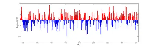 Dans sa phase positive, la ceinture de vent d'ouest qui entraîne le courant circumpolaire antarctique s'intensifie et se contracte vers l'Antarctique[4]. Sa phase négative implique que cette ceinture se déplace au contraire vers l'équateur.