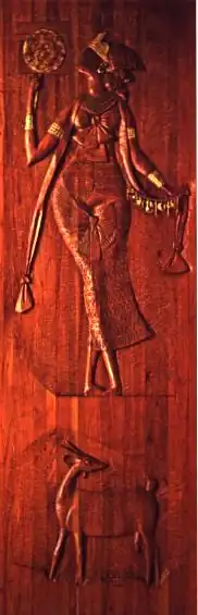 Oshun, Oxum (dans le Candomblé brésilien), Ochun (dans la santeria) est une orisha qui règne sur les eaux douces, considérée comme la dame de la beauté, de la fertilité, de l'argent et de la sensibilité. Intimement associée à la richesse spirituelle, matérielle et à l'émancipation des femmes, elle est représentée par une élégante femme africaine, parée de la tête aux pieds de bijoux en or. Elle est assise au bord d'une rivière, avec un miroir rond et doré, alors qu'elle allaite avec un bébé sur les genoux. Elle est vénéré dans le Candomblé, l'Umbanda et dans plusieurs religions afro-américaines.