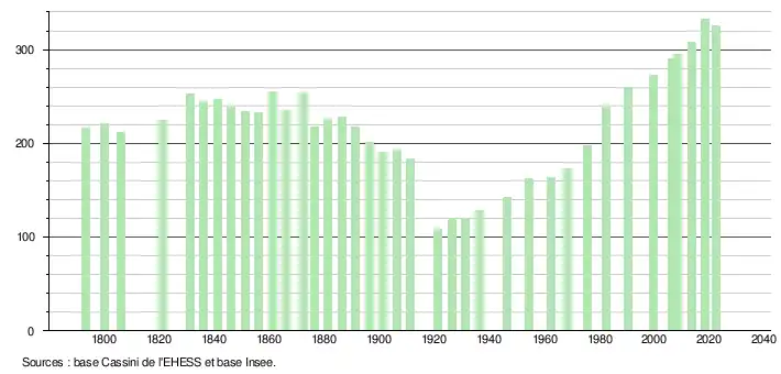 L'évolution du nombre d'habitants est connue à travers les recensements de la population effectués dans la commune depuis 1793. Pour les communes de moins de 10 000 habitants, une enquête de recensement portant sur toute la population est réalisée tous les cinq ans, les populations de référence des années intermédiaires étant quant à elles estimées par interpolation ou extrapolation[26]. Pour la commune, le premier recensement exhaustif entrant dans le cadre du nouveau dispositif a été réalisé en 2008[27].
